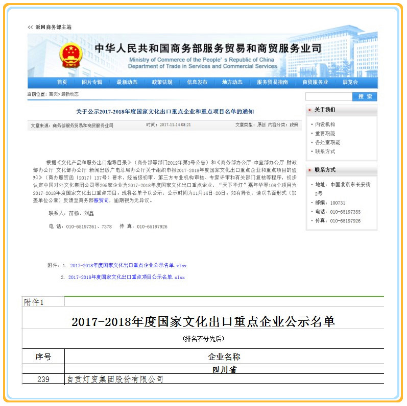 自貢燈貿(mào)集團股份有限公司入錄“2017-2018年度國家文化出口重點企業(yè)”公示名目。這是自貢燈貿(mào)集團股份有限公司自2007年以來,第六次榮獲此殊榮,也是全國彩燈行業(yè)唯一連續(xù)六屆十二年獲此殊榮的企業(yè)。