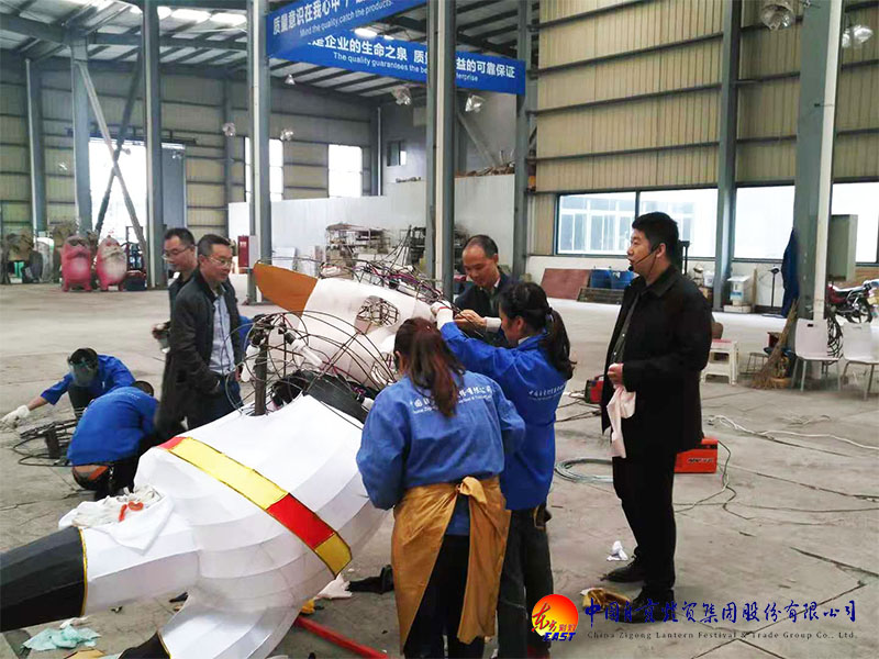 考察領(lǐng)導(dǎo)在“東方彩燈”出口基地制作車間饒有興趣的參觀燈組制作現(xiàn)場(chǎng)。