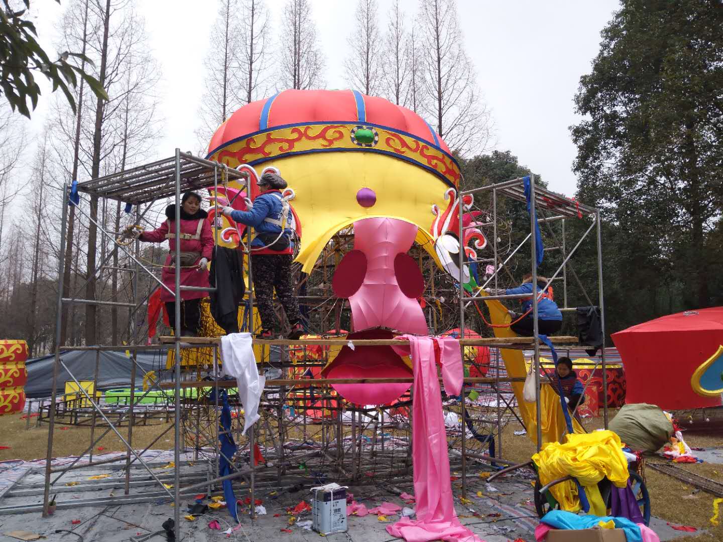 目前,東方彩燈身懷技藝的制燈匠人正緊鑼密鼓的制作中。那些看上去冰冷粗獷的鐵絲、綢緞,在他們“馴化”下變得溫順隨和,一組組或生動(dòng)、或委婉、或雄渾的燈組栩栩如生。本屆“太陽節(jié)”較大的突破是所有燈組均采用節(jié)能環(huán)保燈具,較之往年減少三分之二的用電負(fù)荷,打造炫彩奪目的燈光效果的同時(shí),保護(hù)了環(huán)境和游客。在制作方面,部分主要大型燈組均采用加密色丁布裝飾,傳統(tǒng)燈組結(jié)合現(xiàn)代科技,民俗風(fēng)情融合時(shí)尚藝術(shù),集現(xiàn)代感、藝術(shù)感為一體,凸顯顏色豐富的層次感。