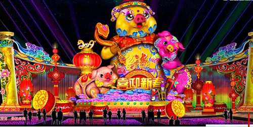 本屆太陽節(jié)以《太陽崇拜》、《玉米門神》等瑪雅諸神燈組,以及《夢幻森林》、《動(dòng)物世界》里與瑪雅人息息相關(guān)的動(dòng)物燈組,與《古蜀文明》、《古蜀生活》中古蜀人漁獵農(nóng)耕和祭祀相關(guān)的燈組交相輝映。園區(qū)氛圍營造也極具特色,瑪雅象形文字、古蜀紋飾等元素將帶領(lǐng)觀眾進(jìn)入兩大文明交匯的海洋。當(dāng)然,應(yīng)景的“年味兒”也必不可少,東方彩燈打造金沙節(jié)史上最大的立體生肖豬造型,向觀眾送上新年祝福。