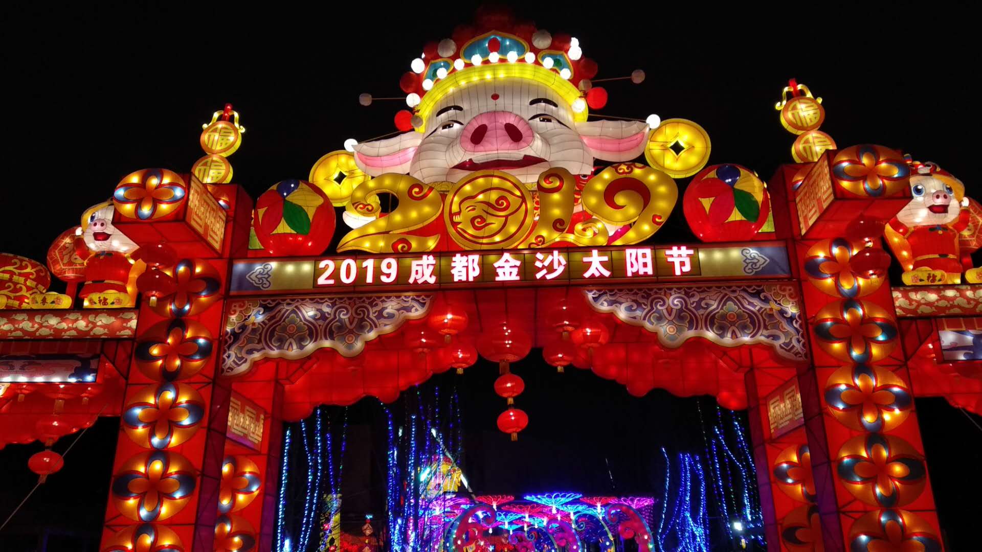 金沙太陽節(jié)史上最大的立體生肖造型,卡通豬組合燈組“金豬賜?!保蛴慰蛡鬟f豬年的美好祝福?!叭朔晔⑹狼闊o限,豬拱華門歲有余”,歡樂祥瑞的金豬將福澤灑滿天府大地。