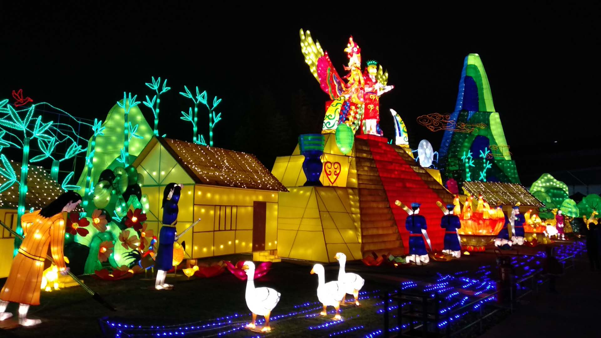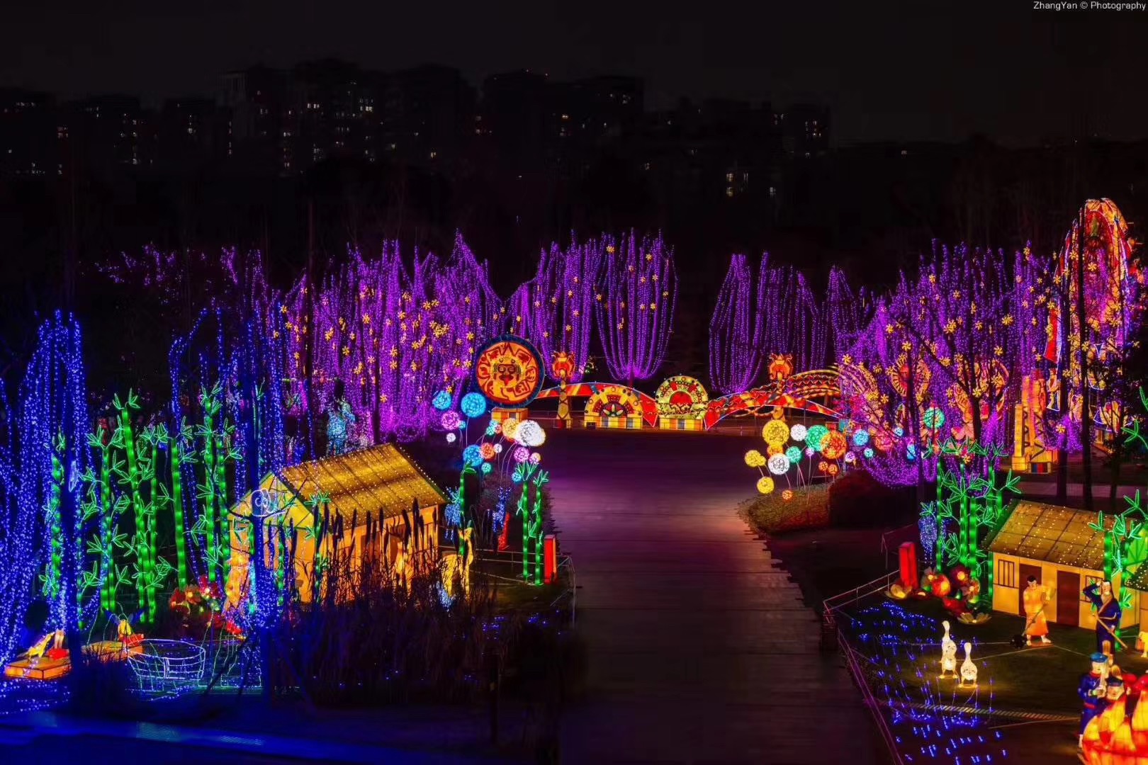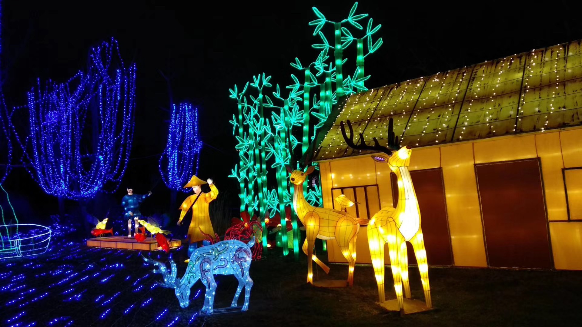 遺跡館外的“古蜀家園”也是本屆太陽節(jié)規(guī)模較大的燈組之一。竹林、小屋、麋鹿等景觀再現(xiàn)古蜀國的自然生態(tài)環(huán)境。彩燈刻畫出一組一組栩栩如生的景色,再現(xiàn)古蜀生活時的盛大場景。