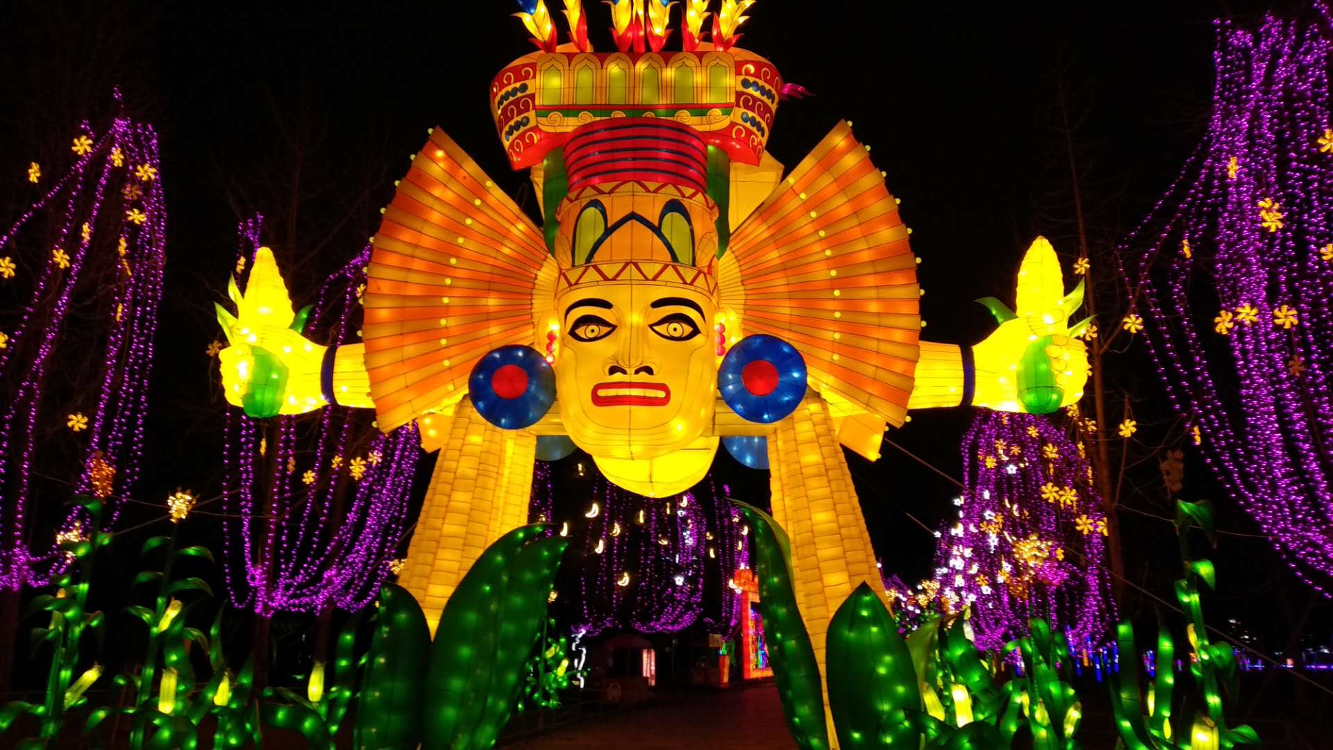 “瑪雅之光”是本屆太陽節(jié)燈組的又一大亮點。首次運用彩燈的手法,再現(xiàn)神秘的瑪雅世界,引領(lǐng)游人穿越時空,欣賞這一古老文明留贈現(xiàn)世之美。作為中美洲熱帶叢林中悄然萌芽卻又戛然而止的神秘文明,瑪雅的象形文字、宇宙觀念、創(chuàng)世傳說、神靈崇拜及其精神信仰都成為燈組著力表現(xiàn)的內(nèi)容。