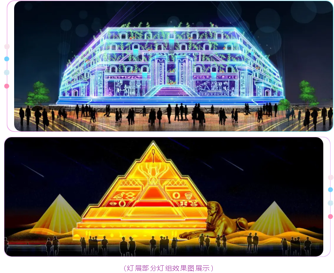 由自貢燈貿(mào)集團(tuán)股份有限公司承制的“桔橙光影 大雅丹棱”燈光節(jié),以“北緯30度,世界最神奇的存在”為主線,情景展開(kāi)這一緯度上的奇觀絕景和神秘文化。精湛的彩燈工藝和現(xiàn)代光影技術(shù),散發(fā)著異乎尋常和夢(mèng)幻的光影色彩,為游人展示北緯30度各國(guó)的文化表情和最璀璨的古老文明。