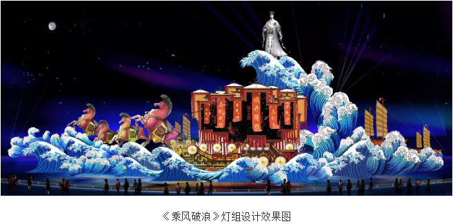 西區(qū)湖面上,長65米,高22米的主題燈組“乘風(fēng)破浪”是本屆廟會中的“巨無霸”,利用現(xiàn)代燈光技術(shù)以獨(dú)特的藝術(shù)手法展現(xiàn)了三國時期的著名戰(zhàn)役——赤壁之戰(zhàn)。一幕精彩的三國故事圖卷將在波光粼粼的湖面上徐徐鋪展。