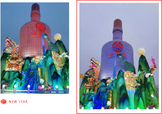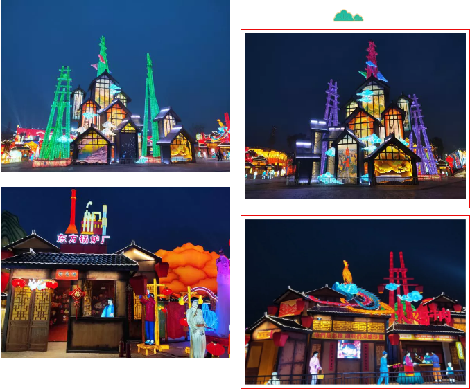 《自貢記憶》主燈組使用傳統(tǒng)材質結合現(xiàn)代工藝,宏偉的天車獨創(chuàng)性的使用啤酒瓶制作,配合追光變色形成絢麗奪目的燈光效果。顯示屏剪影式表現(xiàn)自貢元素??铸埓┬小㈠\鯉游動,還有靈活靈現(xiàn)的自貢歷史場景和人物,還原了一幅原滋原味又生動的老自貢記憶。