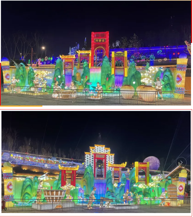 《五糧液》主燈組采用第八代五糧液酒瓶運用自貢彩燈傳統(tǒng)工藝捆扎而成巨型五糧液,輔以仙山、仙境、巨龍騰越氛圍闡釋五糧傳奇,杯酒時光,百年味道。周邊群燈組展示封存在時光中的“活窖池”--利川永、張萬和、劉鼎興、天賜福、聽月樓、全恒昌等八家明代釀酒作坊,歷史悠久的古窖池群講述著傳承幾百年的五糧液釀酒工藝,折射幾千年氤氳酒香的中國酒歷史和酒文化。