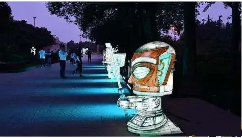 在主干道兩側(cè),各有一排青銅人像燈組,此處燈組復(fù)刻了三星堆祈福神官主題盲盒中的青銅人物形象,其中,有大家所熟知的青銅大立人像、雙手合十許愿狀的青銅戴冠縱目面具、平頭與圓頭的“金面使者”等,造型獨(dú)特,形象鮮明。融入現(xiàn)代藝術(shù)設(shè)計卡通Q版形象,加入活潑可愛的人物性格,使文物生動起來。