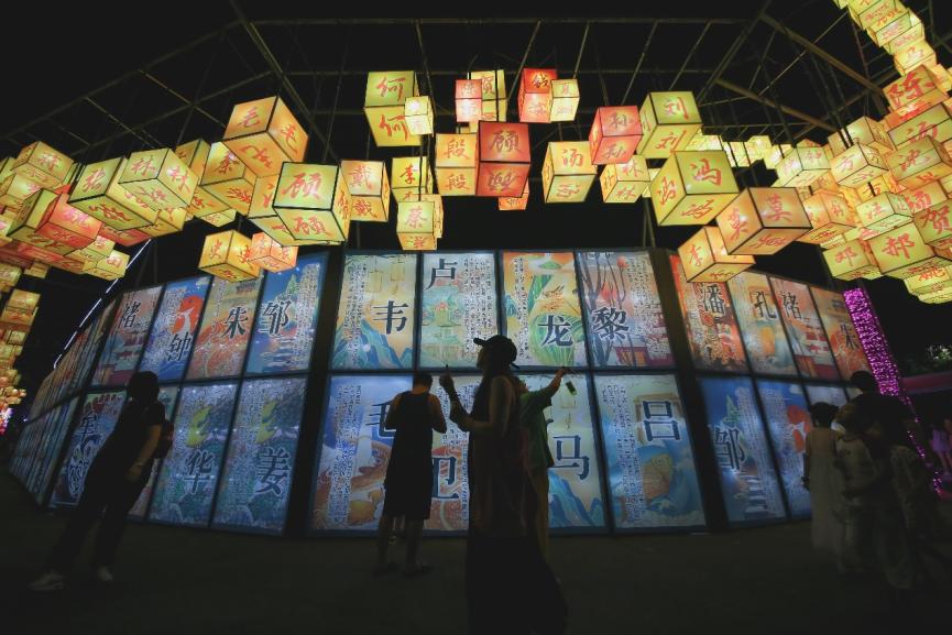 本次燈會(huì)刮起濃濃“國(guó)潮風(fēng)”。燈會(huì)入口是一座中式建筑風(fēng)格的迎賓門,長(zhǎng)達(dá)50米的迎賓廊道掛滿燈籠,市民游客穿行其間,恍如置身漢唐;十二生肖彩燈俏皮靈動(dòng),精致絢爛;百余句經(jīng)典詩詞點(diǎn)亮道旁樹木;百家姓燈籠組成長(zhǎng)龍,中華傳統(tǒng)文化韻味十足。